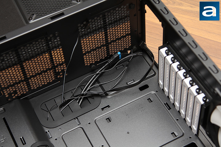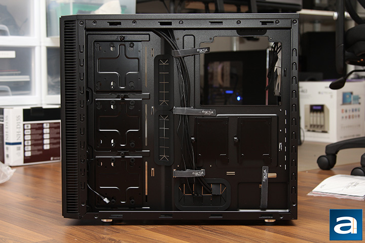 The back of the motherboard tray is also quite fundamental to good cabling. This is especially held true with the Fractal Design Define S, since it is normal practice to cables through this section. With the latest iteration, the company kept gap wide; the amount of room between the side panel and motherboard tray is a generous 20mm to 40mm. Users will not experience problems if you own a power supply with very thick cables. Like the Define R5, there is an integrated cabling guide; three Velcro straps allow for easy organization in this area. New to the Define S is a fourth Velcro strap, which can be found at the lower right hand corner. Lots of openings can be found so you can fish your cables through, and they are large and wide to carry everything you need. Rubber grommets are found at all openings, which is a very nice touch. I have actually had cases in the past where cables started rattling against the metal panels, and trust me -- that could be annoying. The rubber grommets are clipped on pretty well, but if you rip your cables through these holes during your build, they may become loose, although it is not a significant problem.
