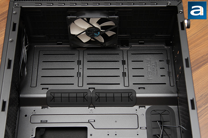 The Define S is able to accommodate mITX, mATX, and ATX motherboards. The riser mounting holes are labeled for users who are not familiar with building their own computers. One 140mm pre-installed rear exhaust fan is situated around the CPU socket area of a standard ATX motherboard. The stock fan is a 1000 rpm Dynamic GP14 from Fractal Design, and features a 3-pin motherboard header. Three more fans, sized up to 140mm, can be installed at the top of the case. It can also accommodate 420, 360, 280, 240, 140, or 120mm radiators with a maximum thickness of 55 mm. As mentioned on the previous page, all upper vents are sealed off by default by what Fractal Design calls the ModuVent. Normally, putting noise insulating foam here may cause undesirably high temperatures. Fortunately, according to our tests, the soundproofing material has little detrimental effect to the case's cooling performance. Additionally, because the covers are completely flat, it makes a lot of aerodynamic sense -- low airflow impedance. My only complaint, as already discussed, is the openings here are way too large.