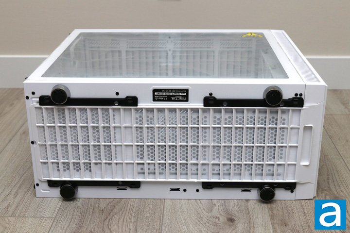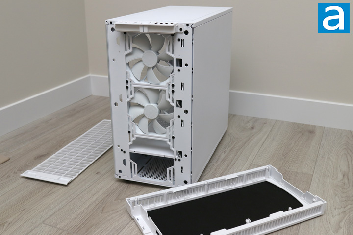 At the bottom of the case, we have a very similar layout once again. We also see the black and white theme here with the darker feet and filter holders. Four legs can be found at the bottom with one in each corner. These legs provide the chassis about 2 cm rise over the surface it resides on. For those who want more fans, the bottom panel here has room for up to two 120mm or 140mm fans or a radiator as large as 280mm. The washable fan filter for all the bottom intake fans can be seen in our photo above. It can be removed from the front of the case for cleaning. At the back, we also have the intake for the power supply, which is covered by the same aforementioned filtered.