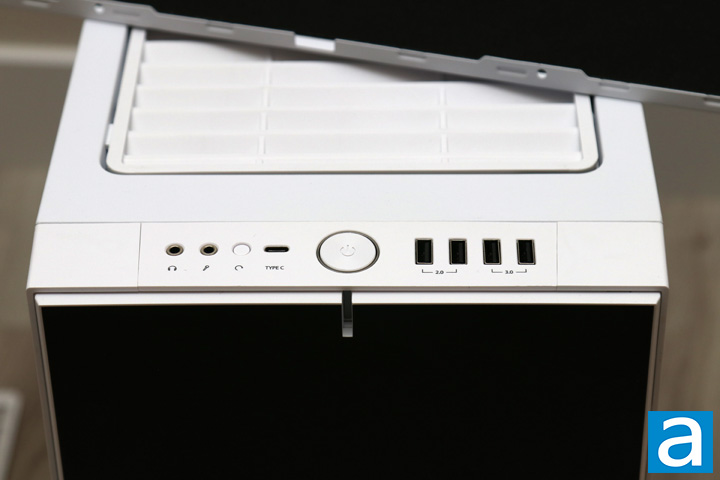 Moving back, we have the same updated ModuVent cover we saw with the Fractal Design Define R6, except now in white. As such, Fractal Design offers multiple ways to use this area. Traditionally, the top has become useful for exhausting hot air out. As this follows the natural process of heat rising, it makes sense. However, this also allows dust to settle into your case through the top area. In response, case manufacturers have often just put mesh filters on top and called it a day. On the other hand, some users want a quieter build, and thus some cases do not have any opening here. Instead of going after one or the other, Fractal Design used this updated ModuVent system to accommodate for both users. The thick panel at the top actually separates into two different panels, depending on what you want to do. If you want to use the top area for mounting cooling, you can keep the mesh filter to prevent dust from entering while letting air out. If you want a quieter build, you can pop the steel panel on with sound dampening material to close off this opening and silence any annoying noises inside. It is not the easiest part to separate from each other, but I have yet to see anyone create a better solution for this and I am quite impressed nonetheless.