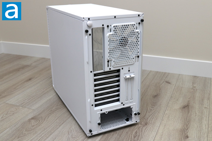 Moving to the back, the rest of the case follows the same black and white color scheme with a standard layout. At the bottom, we have the power supply opening with a removable bracket for ATX power supplies. Moving up from here, we have the standard seven black slots for expansion cards, plus another two white ones for vertical mounting. It should be noted you will have to purchase separate cables and mounting equipment for the vertical mount, but it is available from Fractal Design with their Vertical GPU Riser Kit. Further up, we have the opening for the motherboard connections with the exhaust fan located right beside it. This is another Dynamic X2 GP-14 fan, which is great to see. We usually only have spacing for fans of 120mm in size, but the Define S2 has spacing for both 120mm and 140mm cooling options. The fan is also mounted on rails so you can slide the fan up and down depending on the rest of your components. Finally, on the top left side, we have a large push button to release the ModuVent top cover. As for the other side panel, you can see that this is held on with two thumbscrews. It also swings out and is held on the lock set of ball and socket joints like the glass panel.