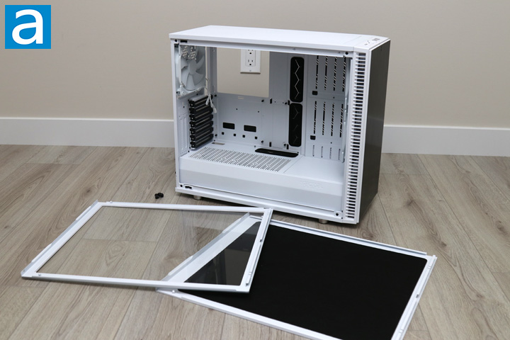 Removing the side panels is a pretty straightforward job as we have already mentioned. Once you remove the thumbscrews from the back of each panel, you can pop it off the ball and socket joints and swing it out. I would have liked to see captive thumbscrews used here, especially since they are so common for convenience. You can see the glass panel and the solid steel panel in front of the case. The black fabric is Fractal Design's excellent sound dampening material that remains thin but heavy to remove noise while not insulating too much heat. Otherwise, the inside of this Fractal Design Define S2 is white and black with an open interior overall. Various elements like the expansion card slots, rubber grommets, and some removable parts are black, while the rest of the interior maintains a white look, including the fans. This layout is pretty typical with the power supply mounted at the bottom, separated from the motherboard and the rest of the components. As you can see, the shroud is not solid, as there are slits to let air pass through the two zones. This layout is quite similar to the Define R6 sans a front drive bay.