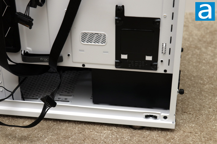 Unsurprisingly, I started by installing the power supply in the basement and routing the necessary cables to the intended places. As you can see, there is a lot of space at the front here, especially since there is no drive cage in front. In addition, you can see how much space still exists between the power supply and the case, which means you can even tuck some cables in front of the unit. According to Fractal Design, you can install up to a 300mm power supply, though I would be surprised if you can even find a unit this long. Of course, you may be more limited if you remove the front area and mount either fans or water cooling components there, though I still think it is unlikely that anyone runs into compatibility issues here. My SilverStone Strider Gold S ST85F-GS 850W is a relatively compact unit, so it looks quite small in this case. I tucked some extra cables in the basement of the power supply. As for routing its cables, I was content with the sufficient number of openings to plug everything in. Between the side, top, and bottom holes, I was able to plug everything in without exposing too much cable. All the rubber grommets were very much appreciated in this regard.