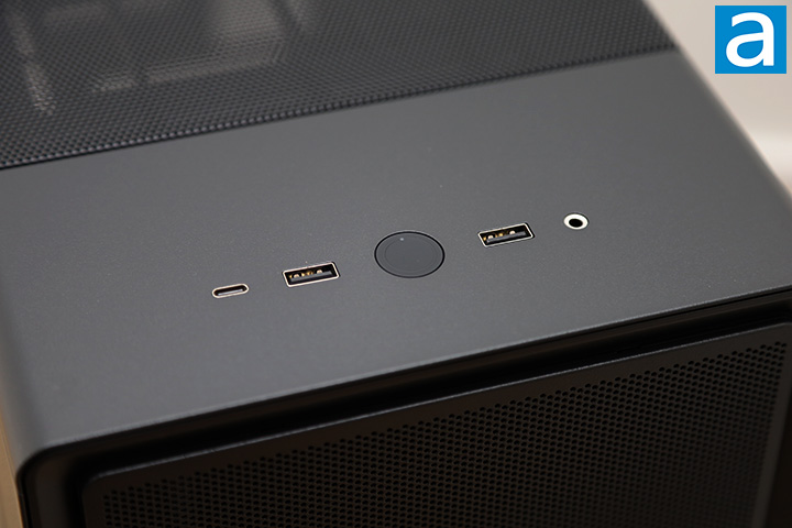 The front panel connectors are located at the top of the Epoch. The designers managed to create a level of symmetry in an asymmetric fashion with its power button placed nice and center. On both sides of the power button, we have two USB 3.2 Type-A ports. Next to the right side USB 3.2 Type-A port is a 3.5mm combination audio jack for headphone out and microphone in, while the opposite side features a USB 3.2 Type-C port. Surrounding the power button is a stylish white LED ring. There is no reset button or drive activity LED.