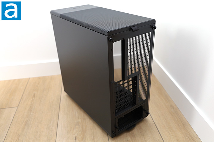 The back of Fractal Design's Epoch Black TG RGB Light Tint is painted black to match the rest of the chassis, and is pretty much standard for a case with a bottom mounted power supply bay. We can expectantly spot a 120mm fan opening placed adjacent to the motherboard I/O backplate. The fan itself is not included. Four captive thumbscrews, two for each panel, can be seen in our above photo.