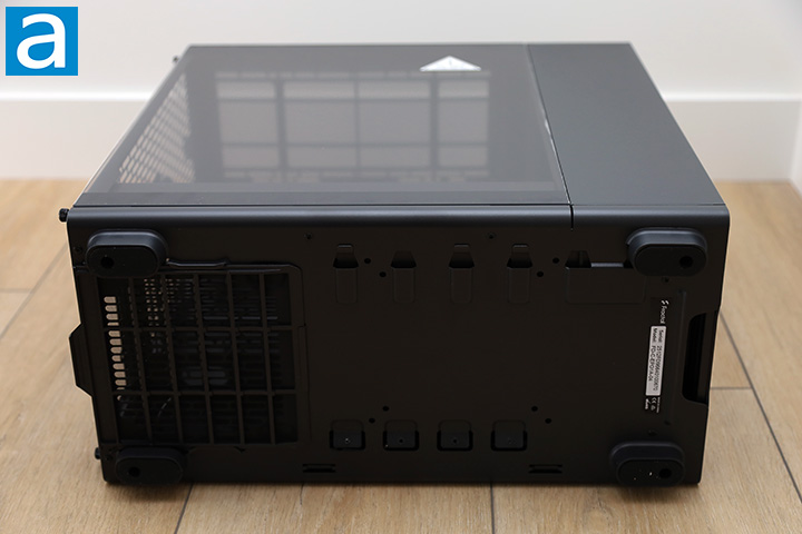 Four fixed plastic feet with rubber pads can be seen on the Fractal Design Epoch Black TG RGB Light Tint. The legs provide the chassis about 2 cm rise over the surface it resides on. No bottom intake fans are supported. The rear tab of the washable power supply fan filter can be seen in our photo above, which can be pulled out for easy cleaning.