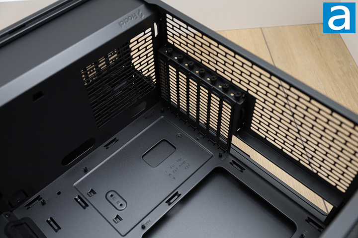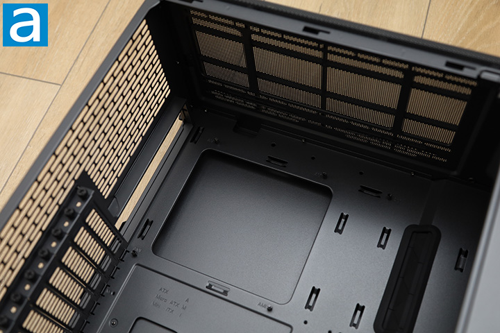 The Epoch is able to accommodate mITX, mATX, and ATX motherboards. The riser mounting holes are labeled for extra convenience regardless of PC building experience. No pre-installed rear exhaust fan is situated around the CPU socket area of a standard ATX motherboard, but the opening can accommodate one 120mm unit. The upper ventilation area is open with a mesh. I would much rather have, at the very least, a dust filter here, because the holes in the mesh are rather large and will not keep much out. Two 120mm or 140mm fans or a radiator of equivalent size can be installed at the top of the case.