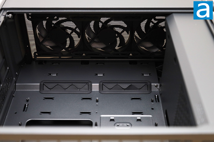 No bottom intake fans or radiators can be installed into the Epoch. The Epoch can take power supplies up to 255mm long with one HDD tray installed or 155mm with two HDD trays installed. With no HDD trays installed, you can have a PSU that spans the entire length of the case. Of course, this is just a trivial fact, because I do not believe something of such a size exists in the world, haha.