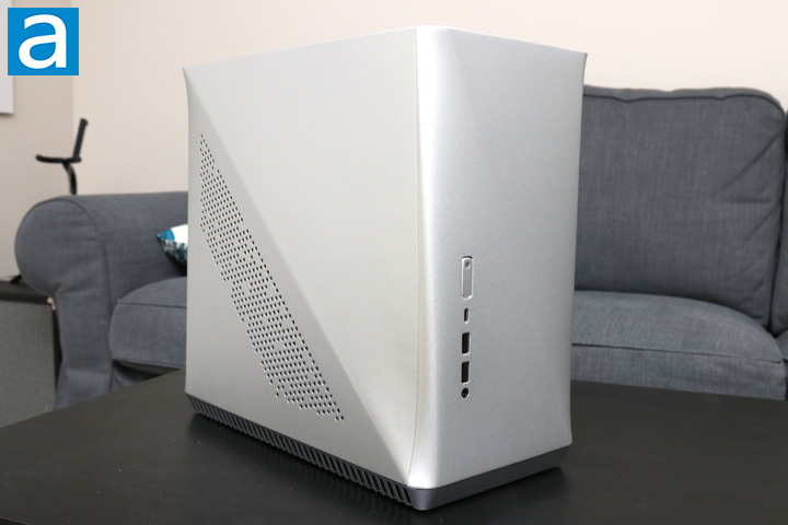 From the front side, you can see the front inputs and outputs on the Fractal Design Era ITX. At the very top, there is a rectangular power button with an opening for the power indicator LED. Underneath, we have a USB 3.1 Gen. 2 Type C port, which is as expected for a case in 2020. Under that, we have two USB 3.2 Gen 1 ports, followed by a single combination 3.5mm audio and microphone jack. This is not the first case I have seen with a combination jack, but I would have liked to see a splitter adapter included with this case for the potential use with more traditional headsets utilizing separate audio jacks for input and output. As for the left side panel, we have the nice stylistic diagonal line that protrudes out. Underneath this line, we have an array of holes to let air to pass through here passively. These holes are also lined with a mesh filter to prevent dust from entering at this point.