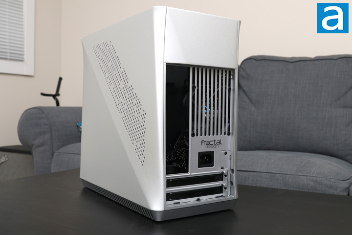 Moving to the back side, we have a pretty typical layout for the opening at the back, though there is one small change. For one, we have the large opening for the motherboard I/O at the back. Beside this opening, we have a lined opening with mounting rails for an 80mm fan at the back for exhaust. While this is pretty small and probably one of the smaller fans I have seen in a while, I am glad to see Fractal Design including it with their Era ITX. Underneath, we have a C13 socket, presumably used to plug into the power supply. As you can see, we do not have a power supply opening at the back, so it is clear Fractal Design had to affix an extension cable inside to connect to the PSU. Underneath, we have two expansion slots to mount various items like video cards. Otherwise, the right-side panel is identical to the left one with the exception of the holes being above the diagonal line instead of below it. It too is lined with a mesh filter.
