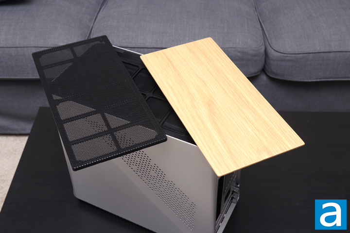 At the top of the case is where we get even more style with the Fractal Design Era ITX. If airflow is your jam, you can mount the metal grid grille at the top. This should allow air to naturally exhaust out the top. On the other hand, if you care more for the appearance, you can mount the finished white oak panel on top of the dust filter for a nice contrast of materials. Both of these panels are mounted using magnets, and they can be easily swapped whenever you want. They also both sit on top of a nylon mesh filter for better dust stoppage and improved airflow. The solid wood panel does not cover the whole top, as the sides still allow air to pass by. As for other colors of the Fractal Design Era ITX, the Titanium Gray version gets a darker Walnut panel, while the Carbon, Gold, and Cobalt versions get a dark tinted tempered glass top. I hope users can purchase additional top panels afterwards to swap out later on.