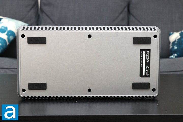 At the bottom, we do not have much that is interesting here to speak about. Four rectangular feet pads are situated in each corner to keep the case in place while preventing the Fractal Design Era ITX from rattling about. The sides on the bottom also show more ventilation slits, to let even more air pass through. These ventilation points are filtered with a mesh grid that is installed in a plastic frame and is easy to remove and clean. It is clear that Fractal Design is trying to maintain decent thermals, even if a lot of the case is a small one.