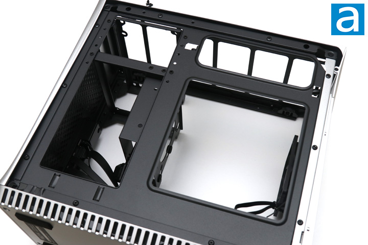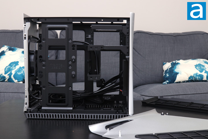 Once you remove the sides, you can get a better look at the Fractal Design Era ITX and its interior. This is an ITX case that supports the mini ITX form factor of motherboards. The whole case may look like an open interior, but this is not exactly the case. The front has no intake for air. Instead, air should travel in from the bottom and out of the top. This allows for the "chimney" effect or stack effect of hot air rising and exhausting out the top of the case. This is why we have the slits at the bottom and an opening to exhaust out at the top. The rest of the components sit in a typical slot, but at the very left side, we have a black tray that sits over the motherboard. This is where you can install various storage options, such as two 2.5" drives or one 3.5" hard drive. It is held on by four screws and can be taken out altogether if you are not using it.
