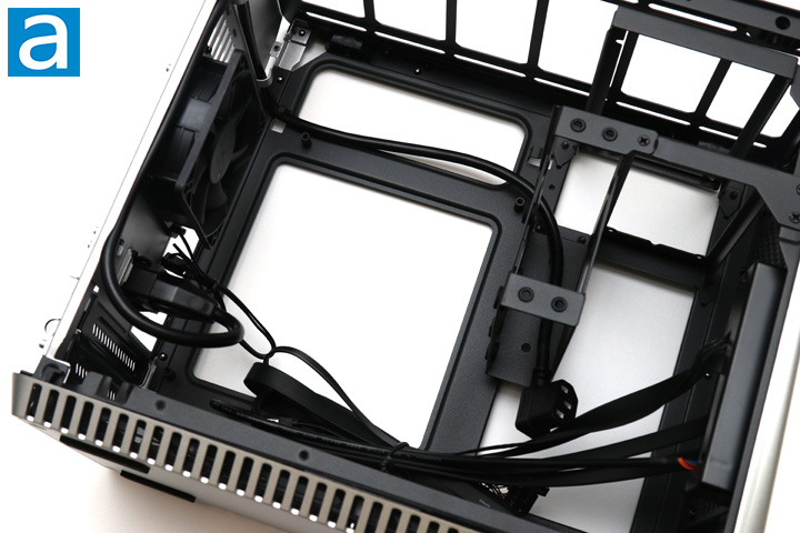 After removing the top tray and the magnetic filter, you can get a better look at mounting positions for radiators or fans. This top area has mounting rails for two 120mm fans, two 120mm radiators, or a single 240mm radiator. You should be careful of your radiator thickness, as Fractal Design does not recommend anything more than 38mm with 25mm fans installed on them. This is also dependent on the size of your power supply and graphics card. While you may not necessarily choose custom water loop cooling in the Fractal Design Era ITX, it is still great to see the amount of support for various cooling mounting positions overall.