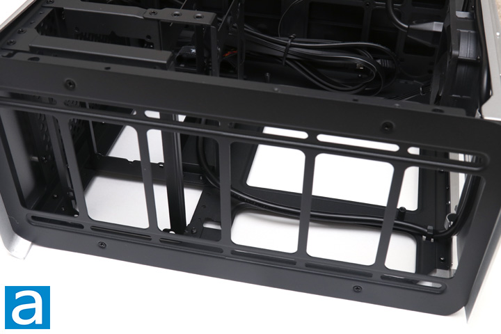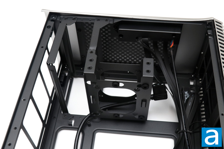 Moving to the front of the Fractal Design Era ITX, you can see this is where the power supply will be installed. As you may have read in the specifications sheet, this case can fit either an ATX or SFX power supply. There are two different mounting positions depending on which size of power supply you install. If you choose the larger ATX format, you will have to forgo the additional disk bracket attached to the SFX mounting arms and install the power supply nearer to the top of the Fractal Design Era ITX. With the smaller SFX mount, you can install the power supply in either the top or middle positions. This bracket also includes a storage cage to store a 3.5" drive or two 2.5" drives. This makes for a total of four 2.5" or two 3.5" drives inside the Era ITX, which is quite a bit when you consider the form factor.