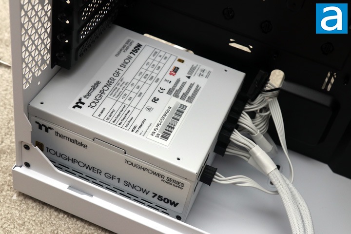 As always, I started my build with the power supply, which included plugging in the necessary cables, mounting the PSU in place, and routing said cables to the correct location. Our power supply is the Thermaltake Toughpower GF1 Snow 750W, which measures 16cm in length. It also matches the whole black and white theme with its cables, which is a side bonus. I will say the cable hole right near the power supply is definitely handy, but I would have liked a slightly larger opening, especially for some of the bulkier cables. As we mentioned, Fractal Design recommends a maximum 175mm length power supply, but there is space for up to a 250mm one. I also routed the front I/O cables into the right spot at this point.