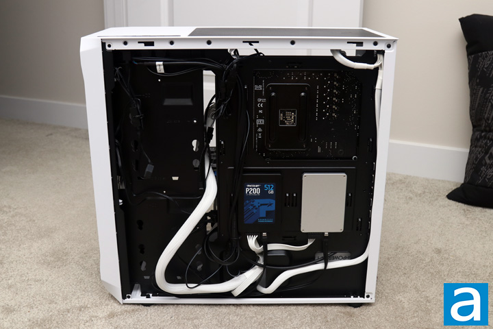From the backside, you can see we have a bit more of a cabling mess, especially as there are no included Velcro straps. I did find the cabling a bit tricky, especially with its smaller routing hole to this back area and the tighter clearance for cables. As for my own storage, I had two drives, the Patriot P200 512GB and OCZ ARC 100 240GB, installed behind the motherboard. Due to my power supply cables being a bit thicker, the drives kept popping out of place as they were installed on the plastic pegs. While this should not be an issue after you install it, it also does not inspire confidence in keeping the drive fully secured in place. Even so, building in the Fractal Design Focus 2 RGB White TG was a very positive experience and I was quite pleased with the creature comforts and compatibility in place, despite the wallet-friendly nature of this case.