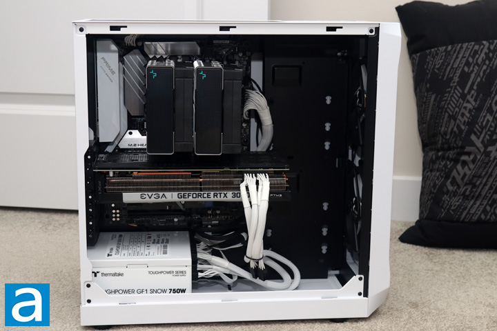 With the power supply in place, I mounted the motherboard, which is an Asus Prime X470-Pro with an AMD Ryzen 7 3700X installed and a set of Patriot Viper RGB DDR4-3600 2x16GB sticks onboard. On top of the processor, I installed the DeepCool AK620, which has a height of 160mm. Fractal Design says the Focus 2 can hold coolers up to 170mm in height, which should hold most coolers. I then installed the EVGA GeForce RTX 3070 FTW3 ULTRA GAMING, which slotted with more than enough space. Even with a front fan mounted, you can install a GPU up to 405mm in length. Afterwards, I plugged everything in place, including the power supply cables.