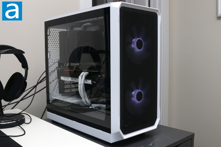 With everything plugged in and the side panels installed in place, I hit the power button and system spun to life. The first thing I noticed was the really neat effect the ARGB fans made behind the front mesh. While the screen-door effect is not preferred for VR gaming, the metal mesh provides a nice glow, especially when viewed from an off-angle. In terms of noise output, our standard APH Networks sound scale ranges from 0 to 10, where 0 is silence and 10 is loud. I would rate the Fractal Design Focus 2 RGB White TG, at stock configuration, at a 2.5/10 under full load. The 140mm fans are quiet, even when spinning at full speed, and its larger size means it can spin at lower speeds for the same airflow, translating into a lower noise output.