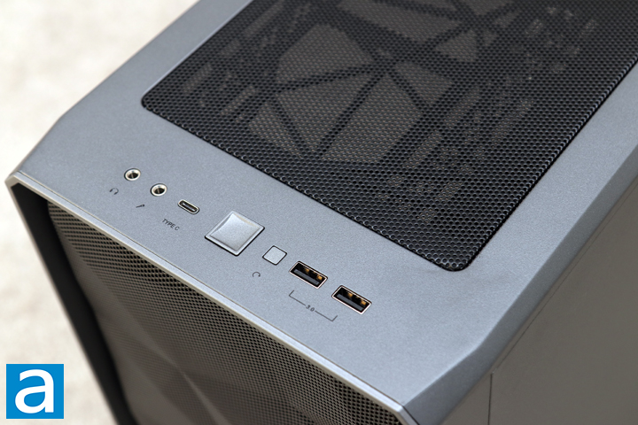 At the top of the Fractal Design Meshify 2 Compact, we have a few updates to point out. For the front I/O, we have a very familiar design to the original Meshify C. In the middle, we have a large square power button. Flanking it on the left side are two audio jacks for the headphones and microphones. Next, we have a USB 3.2 Type-C plug with support for up to 10Gbps speeds. On the right side, we have a smaller square reset button followed by two USB 3.1 Type-A ports. I am quite happy to see that Fractal Design did not remove a Type-A port, as some manufacturers are in the habit of doing, but instead added the newer plug to the rest of the I/O connections. At the back of the top panel, you can see a mesh opening at the top for allowing air to pass through at the top. While the original Meshify C used a magnetic plastic mesh, our Meshify 2 Compact requires users to remove the entire top panel off before removing the mesh filter. I am a bit indifferent to this change. On one hand, this means you will need to put in a bit more effort if you want to clean the top. On the other hand, this enables users to completely remove the top panel for easier installation, as we will see later in our review.