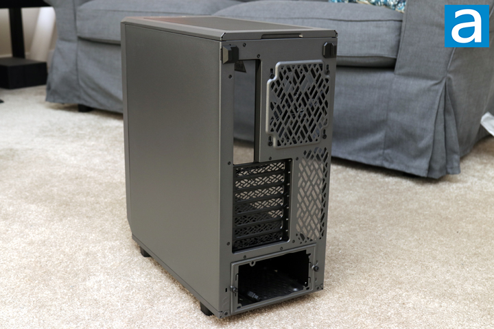 Moving to the backside of the Fractal Design Meshify 2 Compact, you can see the difference that the gray color has compared to a typical black, especially when you compare it to other black elements like the expansion slots. I think this really stands out from its competition even if it is a bit of a subtle difference. At the back we have a pretty standard layout. The motherboard opening is located on the top left corner, with an opening for a 120mm exhaust fan. The grille pattern is not the typical honeycomb pattern, but rather a variation on the Fractal Design logo. This same cutout pattern can be seen on the expansion slot covers and other ventilation areas. Underneath, we have seven expansion slots with a bridgeless design, which means there are no metal bars between each slot. Finally, at the bottom we have a power supply cutout with a removable bracket for installing your power supply. You may have noticed a lack of any screws or buttons to release the two side panels. Instead, these panels are just held on by tabs and can be easily removed by pulling them away from the case. We will explore this on the next page.