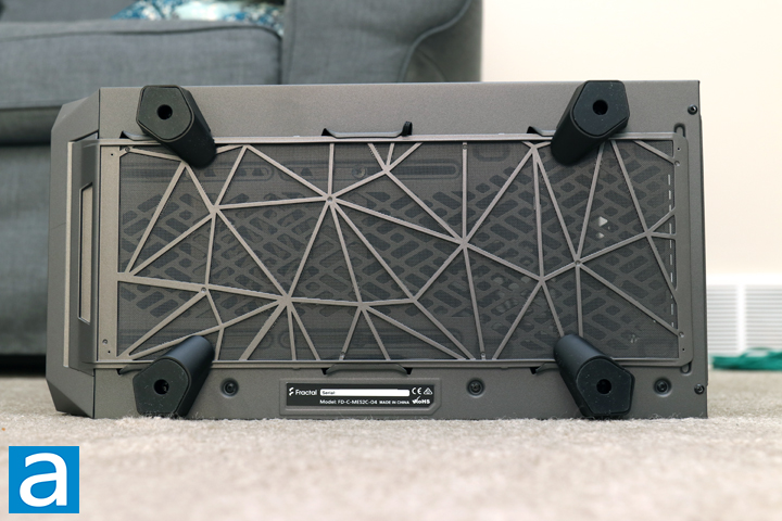 At the bottom of the Fractal Design Meshify 2 Compact, you can see we have most of the expected items you would normally see here. Four plastic feet are found here and each are covered in rubber to cushion the enclosure and whatever it is sitting on top of. This should also reduce vibrations between the case and its standing surface. In between here, we have a large mesh filter that is removable from the front of the Meshify 2 Compact. This should make cleaning the filter easy. You can once again see the "F" logo pattern through the mesh filter.