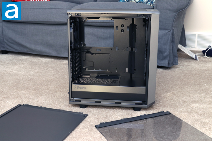 Once you get inside, you can see the open concept design. The entire area is unobstructed for air to pass from the front to the back. The case is divided with the motherboard area for majority of your components and a power supply area hidden under the fixed power supply shroud. You should be able to install motherboards ranging in size from the mini ITX to standard ATX form factors. Unlike the gray exterior, everything internal is black. The surfaces are durable enough so that they do not scratch easily nor does the paint come off. Compared to more typical mid-tower cases, you can see that the Meshify 2 Compact keep its small size by chunking out the space at the front of the case. There is something to like about this more efficient use of space, as we will see later in our installation process.