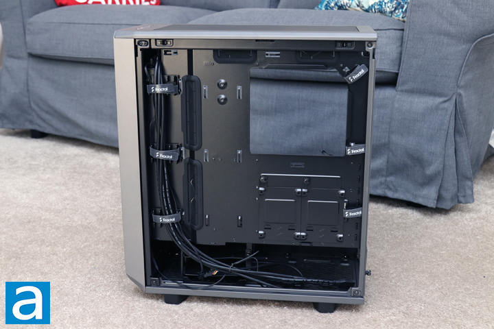 The back of the Fractal Design Meshify 2 Compact is pretty typical with the large rectangular cutout. A full cable valley is located at the front of the Meshify 2 Compact with three Fractal branded Velcro straps for organizing cables. These straps are also attached to a separated cable channel to let users better segregate their cables here for neater organization. Three more Velcro straps can be found on the right side of the case, presumably to be used for the CPU power cable. These straps are just attached to the enclosure, so you can move them around. In terms of cabling space, there approximately 2cm of space between the back of the motherboard tray and the side panel. This increases to nearly 3cm in the cable valley. It might have been nice to see a fan controller here, especially with their Nexus+ 2 fan hub included in the Define 7. Otherwise, all of the cables from the front I/O are nicely sleeved in black cable wrap to keep the all-black exterior consistent. Finally, the power supply area is located at the bottom corner and has rubber pads to ensure the power supply does not create vibration noises during operation. You can also install a 120mm fan at the bottom of the case for some more airflow, but this will impede the drive cage being present and the power supply length.