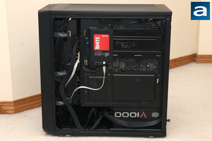 Fractal Design has always delivered in providing an ample amount of space for your cables, and I did not find any issues here. The three Fractal Design labeled Velcro straps were useful in gathering all the excess cables. I routed most of the cables through the lane except for the 8-pin CPU power cable, which was routed up the back side and into the top. In addition, there is quite a bit of wiggle room here to squeeze all your cables in. The extra clearance near the front was much appreciated, allowing cables to sit here without running any interference with securing the right side panel. I also think there were quite a few cable tie points, which really helped in addition to the Velcro straps. I am quite happy with the cabling situation in the back, as everything is situated either in the valley or hidden away under the shroud. Overall, I think Fractal Design has done an excellent job in giving ample room at the back. Otherwise, you can also see the Patriot Ignite 480GB mounted on the triple drive plate.