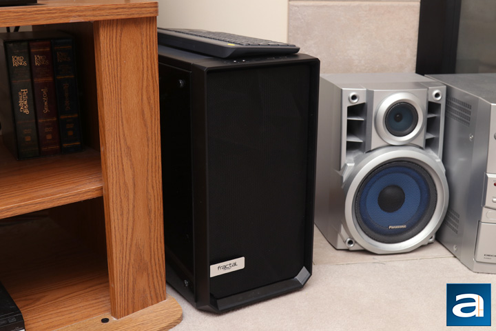 From here, you can see the finished look of the machine. It may not necessarily be made for a home theater computer, as I had issues completely enclosing it in our television stand. However, its subtle and clean look still is fitting for the environment, at least in my opinion. As you can see from the photo above, the window side panel is completely hidden from my eyes, but I still like the darker tint on the tempered glass. According to the standard APH Networks sound scale, where 0 is silence and 10 is loud, the Fractal Design Meshify C Mini is a 3.5/10 on everyday usage. Once again, clear airflow, and not sound reduction, is the main point of the Meshify C Mini, so the tradeoffs are understandable. Thankfully, none of the other parts, like fans or the window, rattle around, keeping overall noise to a minimum.