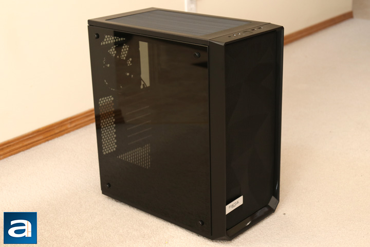 If you somehow skipped the introduction, I talked about how the Meshify C is a design shift for Fractal Design. While you can see it has similar elements to the last Define case we reviewed, the Define C, there are some notable differences too. Fractal Design, whether through user feedback or self-reflection, realized there is a desire for unobstructed airflow in their cases. While their solid front panels did allow for air through the edges, it definitely still hindered. In response, the Meshify C shows off a meshed front panel with holes to allow air to flow directly through the case. Combine this with the Define C's smaller footprint, and you have the Meshify C. Not only is the front mesh, but it is also non-uniform with some angular protrusions on the mesh surface. It may not be the clearest in the photo, but it is visible in person. We also have a glossy edge framing the mesh area, which again is a departure from the conservative Scandinavian looks we have become accustomed to. Taking a step back, this is one of the first Fractal Design cases we have seen where I will say it does not look like a fridge. Overall, I like the approach they took with the Meshify design and while I still like the iconic Fractal Design look, it is nice to see some change here.