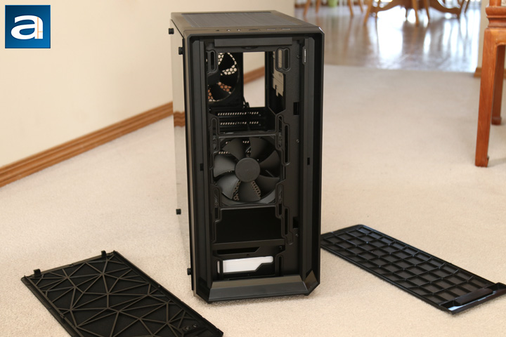 As the front is where the major differences lie, removing it is a slightly different process. To remove the front panel, you must first remove the bottom air ventilation filter by sliding it out the front. Next, from the bottom you will find a small inserted area, where you can pop off just the mesh front for cleaning. If you want, you can also remove the frame around but, but I did not need to do so. As this area is intended to allow air through, we do not have any of Fractal Design's sound dampening material. Instead, you will see the mesh front panel is filtered by a finer mesh to ensure minimal dust enters at this point. Behind this mesh and filter panel are where you can place some intake fans. A maximum of three 120mm or two 140mm fans can be installed on the rails here. Fractal Design has included a Fractal Design Dynamic X2 GP-12 fan at the front for intake purposes.