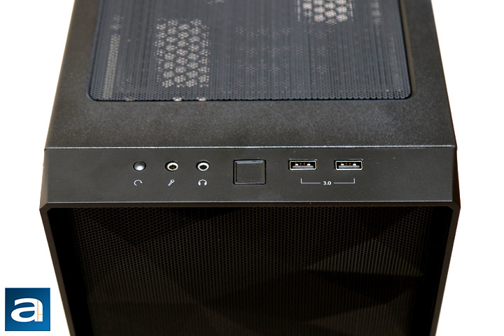 While the attachment may be different, the top-facing I/O is the same set as the previous Define cases, albeit in a modified layout. On the left side, we have a small reset button and two 3.5mm audio jacks; one for headphones and one for a microphone. In the middle is a large square power button. Finally, we have two USB 3.0 ports. While they are not marked with the standard blue connections you see on other cases, I can assure you these are USB 3.0. Unfortunately, there are no new connectors like USB Type-C, which would have been a nice addition. Instead of having a power indicator here, a slim LED is located on the front panel, illuminating to show power status. Finally, at the top you can see a mesh filter covering the top ventilation system. Rather than including the standard ModuVent system, you get airflow through here all the time. As we have already seen, airflow is the main name of the game for the Fractal Design Meshify C, and this makes sense. This is one of the first trade-offs between silence and airflow you will see on the Meshify C.