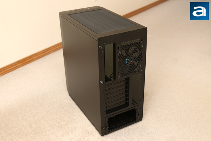 The backside of the Fractal Design Meshify C is pretty standard. On the left, we have the motherboard shield cutout. Beside it is the air exhaust area, where a single Fractal Design Dynamic X2 GP-12 sits. This place is capable of holding a 120mm fan or radiator. As with the Define C, the exhaust fan is slotted on bars, so you can slide the fan up or down, depending on your clearance from other components. Underneath the fan area are seven expansion port covers held in by thumbscrews. By now you can tell this is a bottom mounted power supply case, so at the bottom we have an ATX-size cutout for the power supply. Like the Define C, this ATX-size power supply cover actually comes off, as users need to install the power supply outside of the case and then connect the bracket to the case. The bracket is held on with two captive thumbscrews.