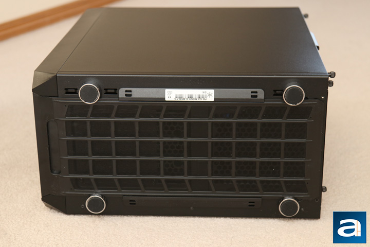 At the bottom of the case, we can see how the Fractal Design Meshify C stands up. Four silver feet in each corner protrude from the bottom, with rubber padding on each of them. This reduces the vibration created between the floor and the case. These feet are not tall enough to ensure adequate airflow in comparison to some other solutions on plushier carpets, but they should be fine on flat surfaces like tables or wooded floors. As already mentioned, you can see the full mesh air filter. Spanning from the front to the back of the case, it is intended to protect the power supply and the rest of your computer parts from dust particles entering here. It is conveniently removable from the front, as alluded to earlier. In addition, a sticker containing the serial number of the Meshify C can be found on the air filter.