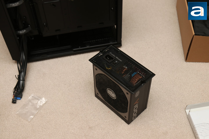 As with all the installations I do, the first thing on my list is take the power supply and slot it into place. In this build, it is the Cooler Master V1000 1000W. A maximum length of 175mm is stated by Fractal Design for the power supply, though I would recommend even less, especially if you need to move the drive cage back. This allows the user to be able to route the power cables with the bottom hole. The next thing I did was routing the necessary power cables. The rubber grommets do an excellent job in only allowing cables through, while blocking the rest of the opening for a cleaner look. ATX layouts are generally more standardized across manufacturers, so the routing options provided here were quite adequate.