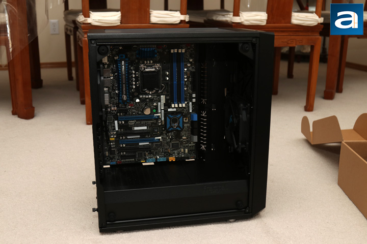 The next step I took was installing the motherboard. I first mounted the Intel Desktop Board DZ77GA-70K in place. As this is a full sized ATX motherboard, it filled up all of the space without overlapping on the grommets. Obviously, any larger motherboard like an extended ATX one will not fit here. My next steps were to install the RAM and the processor, followed by the CPU cooler. If air coolers are your jam, the Fractal Design Meshify C has the width to fit larger heatsinks up to a height of 172mm. For your reference, heatsinks as large as the Noctua NH-D15 measure 165mm in height. On the other hand, if you are installing liquid cooling, radiator options are available up top or at the front, as mentioned previously. My next step would have been to install a graphics card, but I did not have one for this build. A maximum clearance of 315mm in length is available for the video card, which should be plenty of space. However, your mileage may vary, depending on the front cooling options you have mounted. Lastly, I connected the rest of the power, data, front I/O, and fan connections to the motherboard.