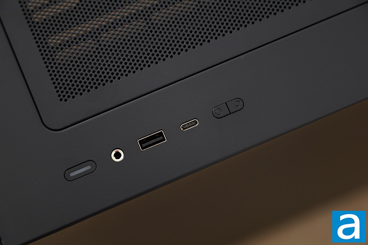 The front panel connectors are located at the top of the Pop 2 Air. They are placed in a line along the front right side. Starting from the bottom and going up, we have an oval-shaped power button. This is followed by a 3.5mm combination audio jack for headphone out and microphone in, USB 3.2 Type-A port, USB 3.2 Type-C port, and last but not least, a split oval-shaped button for RGB LED control. The top half is Color, which allows you to select between Northern Lights, Summer Sky, Sunset, Mystic Night, Emerald Lake, Radiant Dawn, White, Slow Cycle, Freeze Slow Cycle, Rainbow, and off. The bottom half is Mode, which allows you to toggle Shift, On - Static Color, Slow Chase, Slow Breathing, or off. In the middle of the power button is a RGB LED that is synchronized by the controller. There is no reset button or drive activity LED.