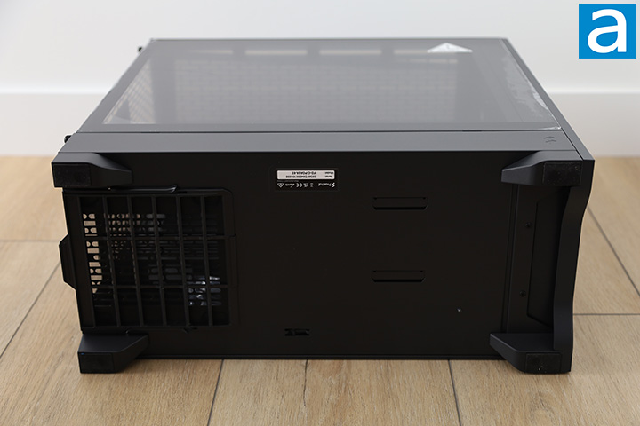 Four fixed plastic feet with rubber pads can be seen on the Fractal Design Pop 2 Air Black TG RGB. The legs provide the chassis with about 2 cm rise over the surface it resides on. No bottom intake fans are supported. The rear tab of the washable nylon power supply fan filter can be seen in our photo above, which can be pulled out for easy cleaning.