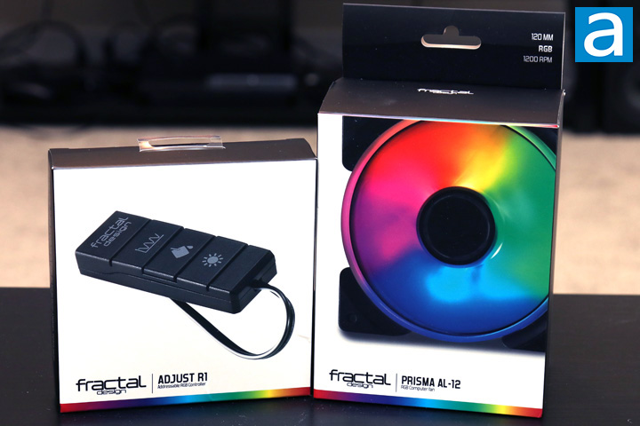 As you can see, both the Fractal Design Prisma AL-12 and Adjust R1 embrace the rainbow LEDs with its retail packaging. Both of them have a white background with a black overlay. The company and product name can be found on the lower edge with a nice rainbow trim underneath. In the middle of both boxes, you will find the product in question, with the addressable RGB controller and the Prisma AL-12 fans all lit up. Otherwise, at the back of both boxes are some features and specifications about the products inside. The Prisma AL-12 also has a flip open front panel so you can get a look at the fans inside.