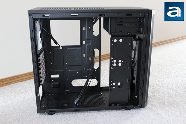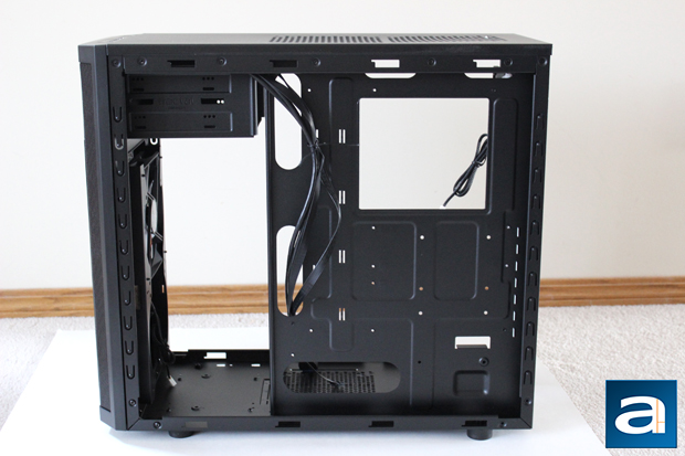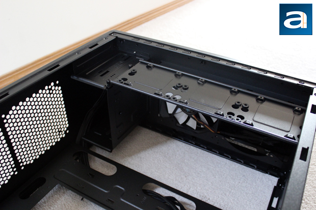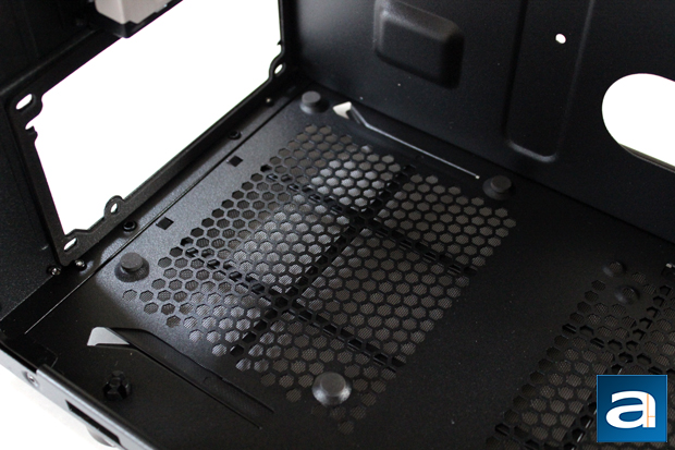 Moving to the bottom, we can see the area where the power supply will be mounted. There are four mounts on the bottom to lift the power supply from the bottom of the case, and they are all foam padded. This helps to reduce the vibration transfer between the power supply and the case, and in turn will reduce noise. After not seeing these foam coverings in past products I have reviewed, this was pleasant surprise, and once again highlights Fractal Design's attention to detail. There is also a foam lining around the mounting hole, which dampens the vibrations caused by your power supply against the back panel. Not a lot of case manufacturers have this, but this is a feature that is borrowed from the Define R4. In terms of spacing for the power supply, there is quite a bit of room, both width and lengthwise. I do not think there is going to be any problem fitting a power supply of any size, but Fractal Design recommends an ATX power supply that is shorter than 170mm if you install a bottom mounted fan. Without this, you can easily put in a larger power supply.