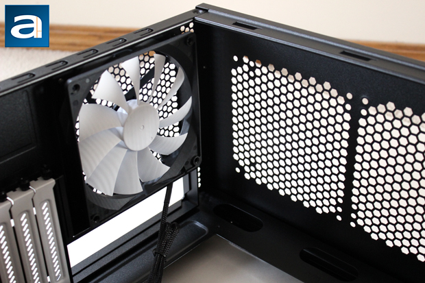 Moving on, we come to the top of the case, where the back facing 140mm Silent Series R2 fan is located. Upon further research, I actually found out these are the exact same fans that come with the Fractal Design Define R4, which is a nice thing to see. These fans are 1000 rpm fans equipped with hydraulic bearings, and features a 3-pin motherboard header. As I have mentioned before, the top vent also supports two 120/140mm or a 240/280mm radiator. Beneath the fan are the expansion card slots, with a standard seven in total, in its Arctic White glory.