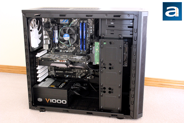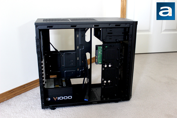 As I have done with every case I have reviewed in the past, the first thing on the list is to install the power supply into the Fractal Design Core 3300. Of course, this is quite an easy task, as my Cooler Master V1000 1000W fit in the spot quite easily. One thing I did notice was how much space I still had, and it just proves to show how wide the Core 3300 is. Normally, I would install the motherboard next, but since the vertical bracket is just crying out to be tested, I threw my Western Digital Caviar Blue 1TB onto the backside of the bracket. With the included flat-head screws, the hard drive fit easily onto the bracket. Never did it feel flimsy, but instead it was very sturdy. Overall, the bracket was easy to use, but I think most users will still prefer the traditional tray, especially when it means they can slide their drives in and out.