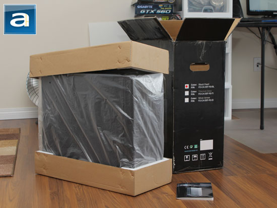 Cracking open the box reveals the Fractal Design Define R3 ATX computer chassis clipped between two large cardboard wrapped foam brackets. Interestingly, our second case does not implement this so-called eco-packaging; the two brackets were purely Styrofoam. We specifically wanted our Define R3 in Black Pearl, but Fractal Design also sells the case in Arctic White, Silver Arrow, and Titanium Grey. Like its bigger brother, my first impression of this case is that it looks like a mini refrigerator -- if we backtrack a bit, I probably won't be surprised to see similar packaging for a designer fridge at Home Depot, haha. We will discuss its external design on its subsequent page. My second impression of this case is if you put the Define XL in a photocopier, hit the 80% button, and boom -- you get the Define R3. Meanwhile, we can see the entire chassis is wrapped in a large plastic bag to protect its panels during transit. For those surfaces that may be more prone to being scratched, additional layers of protective plastic tape is present for the end user to peel off. It is clear to us Fractal Design has taken great care in ensuring their product arrives to the hands of the end user in pristine condition.