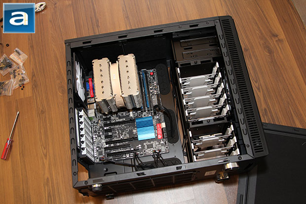 Because Fractal Design bundled all the case I/O wires into one cable, hooking the stuff up to my motherboard is not only easier, but also a lot cleaner looking. The same goes with all the other cables. Pushing them through the large bottom opening adjacent to the motherboard and power supply delivers excellent accessibility to anything that requires a connection to my Z77X-UD3H. Meanwhile, hard disk installation is extremely simple as well; simply align it with the proper holes at the bottom of each drive tray, and attach four screws. The trays can accommodate both 2.5" and 3.5" drives, as discussed earlier in this review. After all the necessary screws are attached, slide it back into the rack, make the proper connections on the opposite side, and you are good to go.