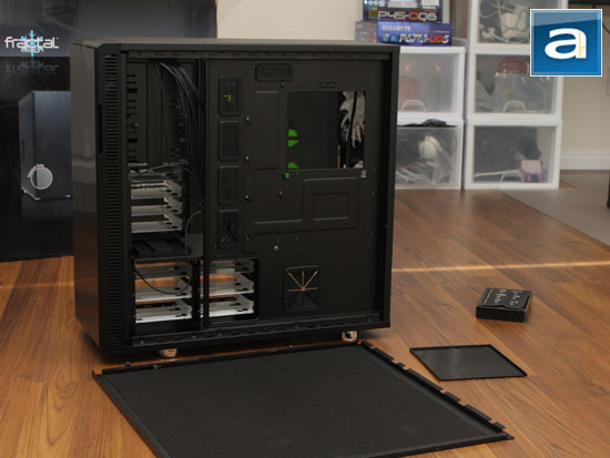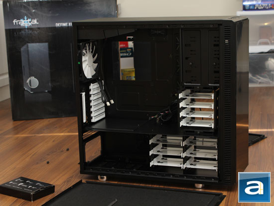 Sliding open the side panels reveal the Fractal Design Define XL's internal dual chamber design. It is not the first time we've seen a dual chamber implementation; it is actually quite popular for high end computer cases. This is especially true for eATX products. The reason for this is for improved cooling by effectively separating heat zones, as well as making cable management a little easier inside. Consistent with its exterior, the interior is also well furnished with all surfaces painted matte black. Meanwhile, the back expansion slot covers and hard drive trays are painted white for maximum color contrast. Measuring in at 560mm in height, 232mm in width, and 561.3mm in length, it is actually not that big considering it is an Extended ATX case. On the other hand, it tips the scales at 39.49 lbs, which is actually quite heavy.