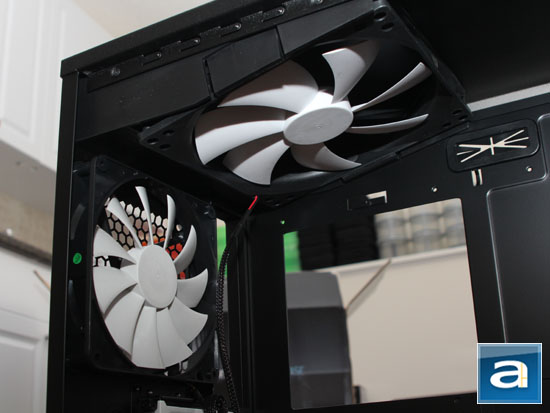 The Define XL is able to accommodate pretty much any motherboard -- this includes mITX, mATX, ATX, and eATX. The riser mounting holes are not labeled, however. Two exhaust fans are situated around the CPU socket area. At the back, we have one 140mm fan; whereas a larger 180mm fan is preinstalled at an angle at the top. Both fans have 3-pin motherboard headers with sleeved cables. Both fans do not have a fan filter, which is not necessary here anyway. The top fan is angled off to send exhaust heat out the back rather than the top. As I have said in the previous page, this is a fusion of the best of both worlds -- top fan exhaust, with no worries about dust from easily entering the system at the top.