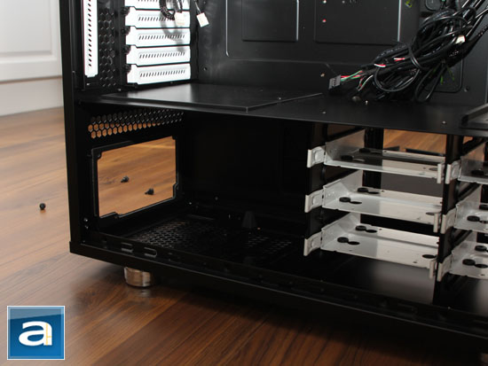 A glimpse of the floor that separates the two chambers inside the Fractal Design Define XL. The panel dividing the two has a large opening in between; with a door closing it off. Unfortunately, you cannot route cables through this opening without removing the door entirely, as it cannot be partially closed. Other than this and routing cables behind the motherboard tray, there are no other methods you can use to connect devices between the upper and lower chamber. Therefore, in order for your ATX 4-pin/EPS 8-pin connector on your power supply to reach the motherboard connector without an extension cable, neat cabling will be a challenge for most people.