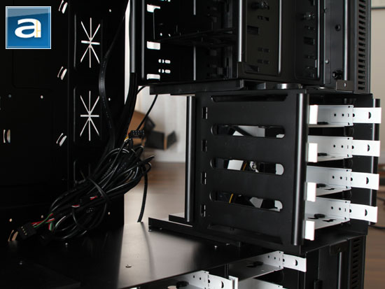 Two non-removable hard drive racks are placed next to each other in the remaining space. Each rack can accommodate three 2.5" or 3.5" drives for a total of six drives. Each tray orients the hard drive perpendicular to the chassis and is painted white; with rubber vibration dampeners pre-installed to reduce vibration caused by installed components. The rubber vibration dampeners must be removed when installing 2.5" drives like SSDs, but that is alright -- SSDs do not vibrate during operation anyway.