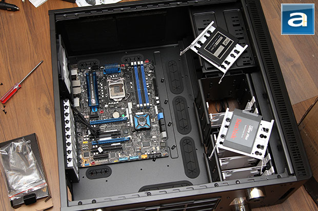 Because Fractal Design bundled all the case I/O wires into one cable, hooking the stuff up to my motherboard is not only easier, but also a lot cleaner looking. The same goes with all the other cables. Pushing them through the large bottom right corner opening adjacent to the motherboard and HDD rack delivers excellent accessibility to anything that requires a connection to my DZ77GA-70K. Meanwhile, hard disk installation is extremely simple as well; simply align it with the proper holes at the bottom of each drive tray, and attach four screws. You can see my OCZ Vertex 3.20 240GB and SanDisk Ultra Plus 256GB in the photo above. The trays can accommodate both 2.5" and 3.5" drives, as discussed earlier in this review. After all the necessary screws are attached, slide it back into the rack, make the proper connections on the opposite side, and you are good to go.